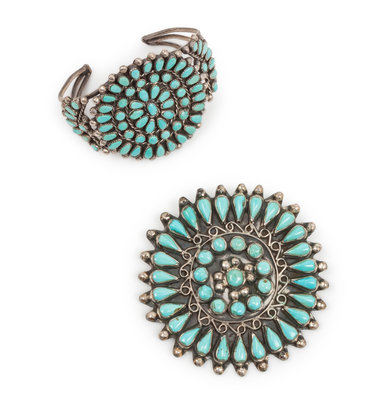Zuni Silver and Turquoise Cluster Cuff Bracelet AND Brooch / Pin