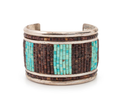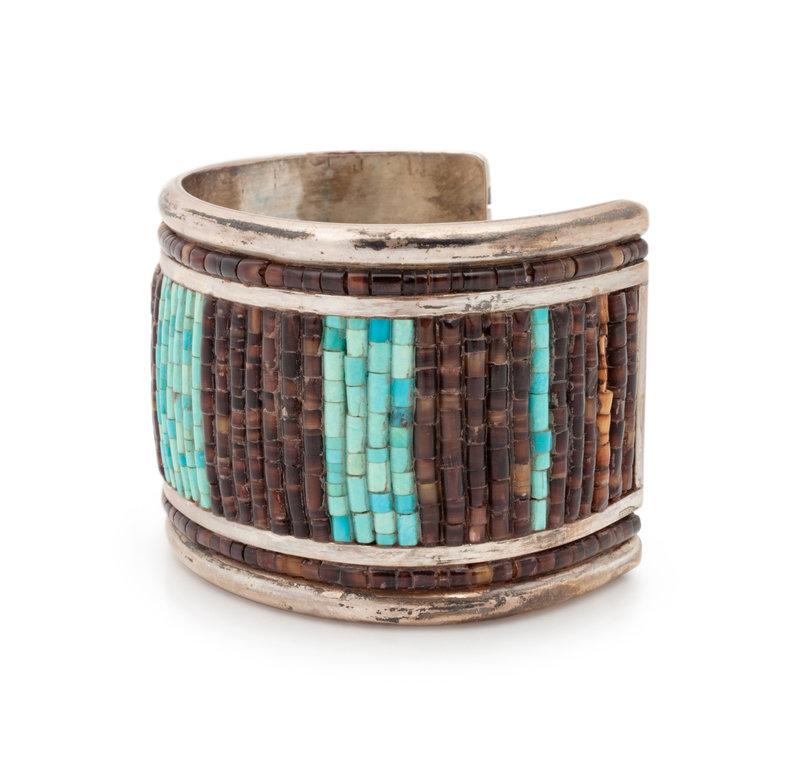 Southwestern Silver Cuff Bracelet, with Rolled Turquoise and Heishi