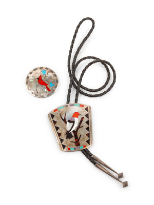 Redheaded Woodpecker Mosaic Inlay Bolo Tie, AND Mosaic Inlay Cardinal Brooch / Pin