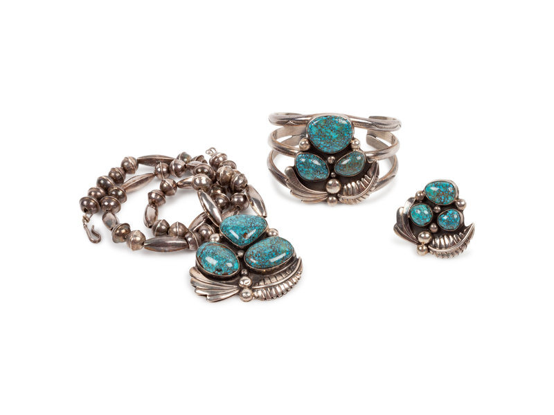 Navajo Silver and Nevada Blue Turquoise Necklace, Cuff Bracelet, and Ring Set