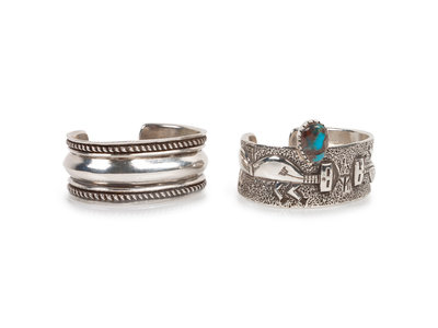 lot of 2, includes a silver cuff decorated with Yei figures and set with a turquoise cabochon; marked INGOT and signed JM Lister, cuff width 1 1/2 inches to end of turquoise, interior circumference 6 1/4 inches x gap length 1 1/8 inches; AND a chiseled silver cuff; marked C LISTER, cuff width 1 1/8 inches, interior circumference 6 inches x gap length 1 inch; combined weight 106.5 dwt.