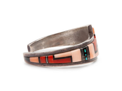 Silver Cuff Bracelet, with Mosaic Inlay Coral, Turquoise, and Jet