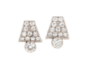Containing two old European cut diamonds weighing approximately 0.75 carat total and 22 old European cut diamonds weighing approximately 0.90 carat total. Mounted in platinum with white gold clip backs.