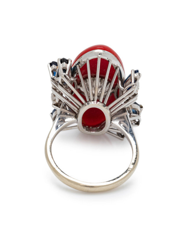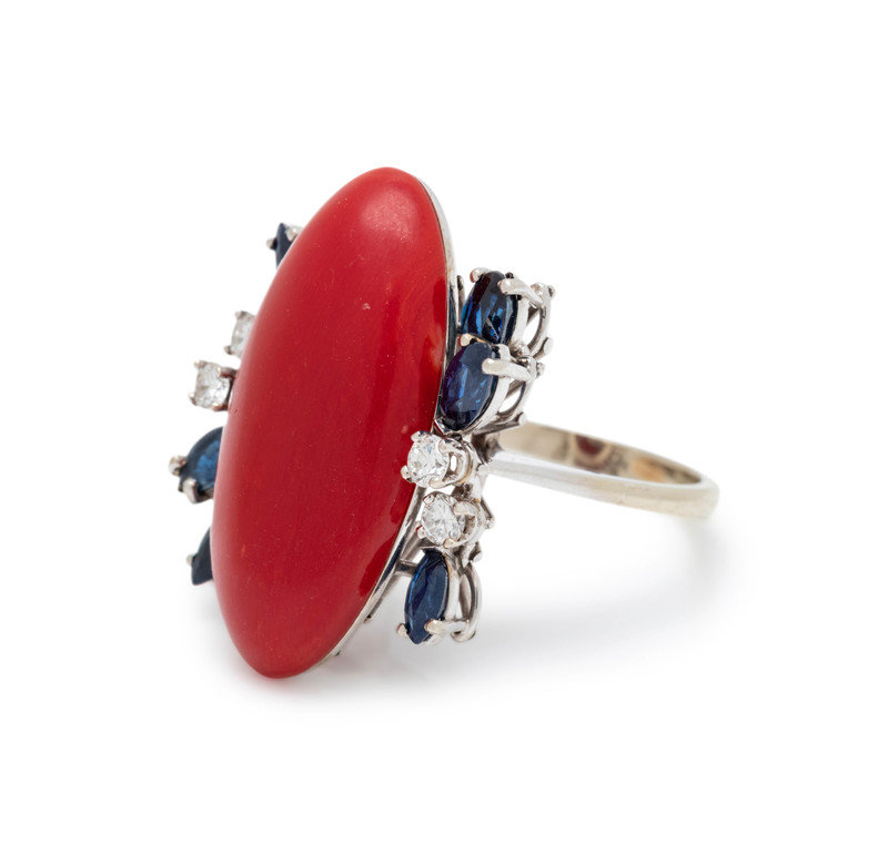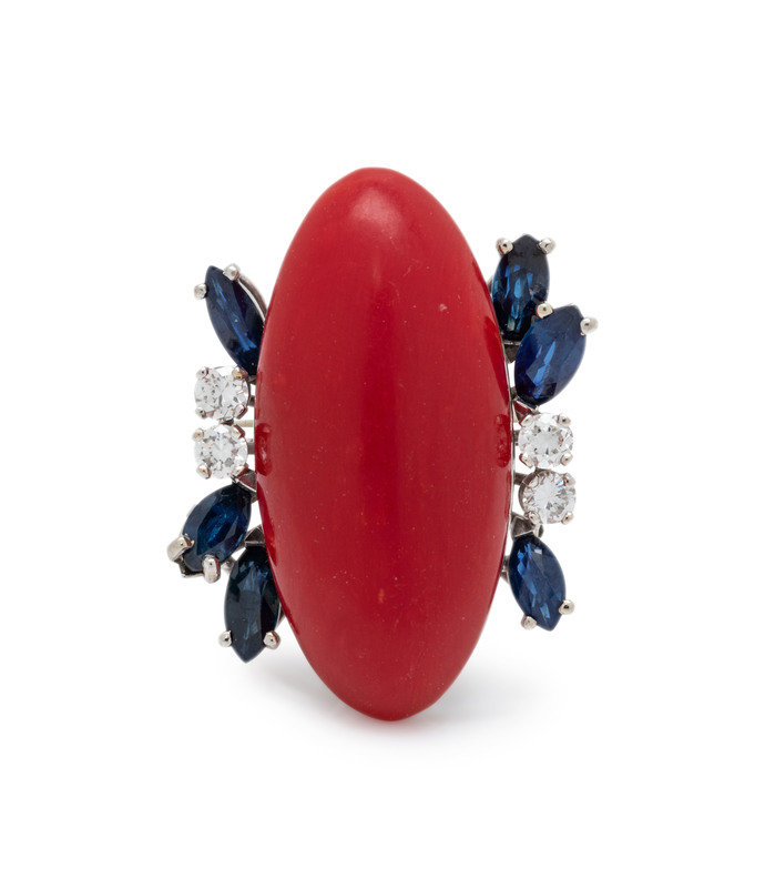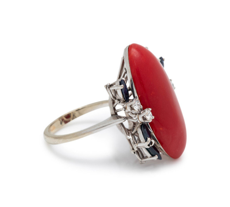 Containing one oval cabochon cut coral measuring approximately 26.00 x 12.00 mm, four round brilliant cut diamonds weighing approximately 0.20 carat total and six marquise shape sapphires measuring approximately 5.60 x 2.20-4.00 x 2.20 mm. Mounted in platinum.