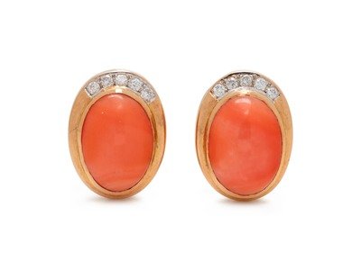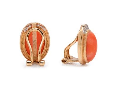 Containing two oval shape cabochon cut coral measuring approximately 13.50 x 9.50 mm and 10 round brilliant cut diamonds weighing approximately 0.15 carat total. Mounted in yellow gold.