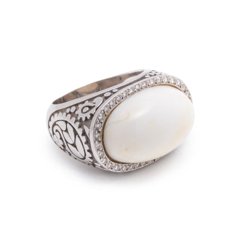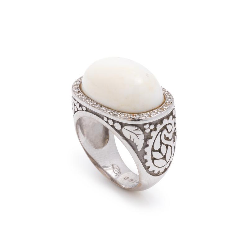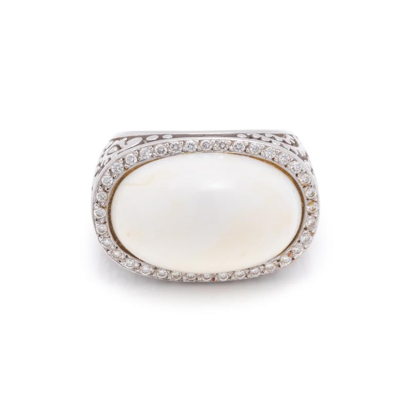 Containing one oval shape cabochon cut coral measuring approximately 12.50 x 19.55 x 8.00 mm and 36 round brilliant cut diamonds weighing approximately 0.15 carat total. Mounted in white gold.