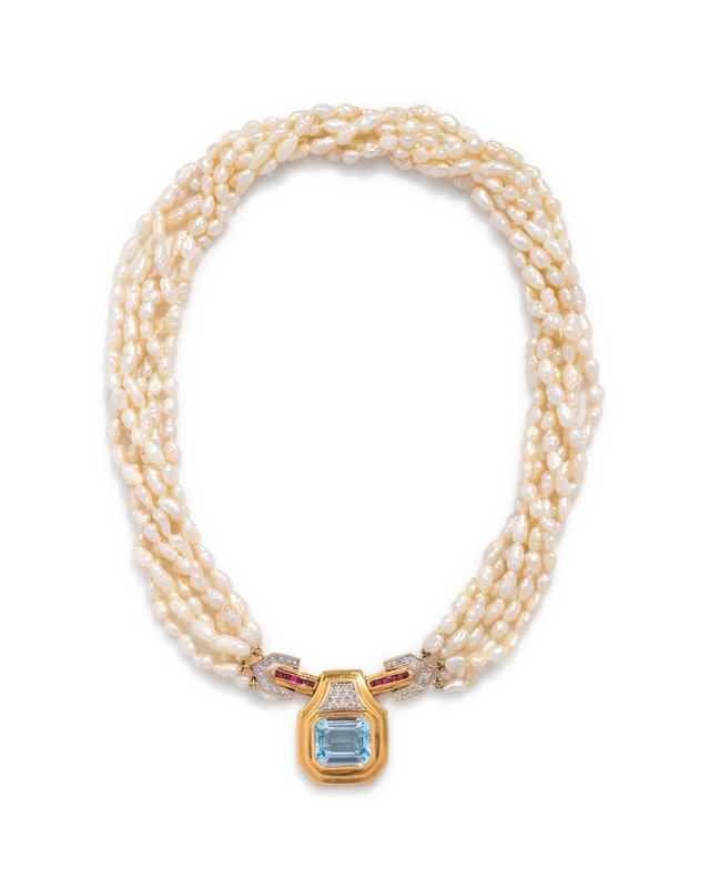 BLUE TOPAZ, DIAMOND, RUBY AND CULTURED PEARL NECKLACE