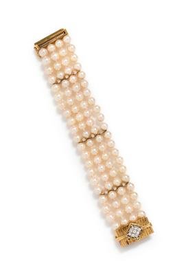 Consisting of four strands of pearls measuring approximately 6.55-7.00 mm in diameter strung knotted with three spacer bars and a clasp containing 18 round brilliant cut diamonds weighing approximately 0.75 carat total. Mounted in yellow gold.