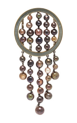 Consisting of a yellow gold and platinum circle brooch with translucent greyish blue enamel over guilloche ground, containing 41 predominantly natural pearls.