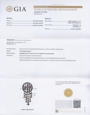 GIA, 2016, Report Number 5172815969, Stating 7 of 41 Pearls randomly tested, Identification: Six Natural, One Bead cultured, Environment: Six Saltwater and One Freshwater, Treatment: Six with No Treatment, One Modified color, Species: Various mollusks, Shape: Variously shaped, Bodycolor: variously colored, Overtone: Variously colored.