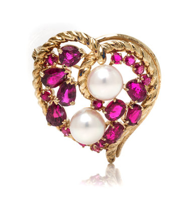 RUBY AND CULTURED PEARL HEART BROOCH