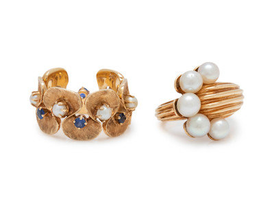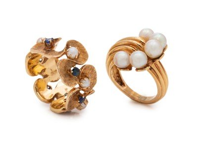 Consisting of a ring containing five pearls, together with ring containing six pearls and six round sapphires in a swirl design.