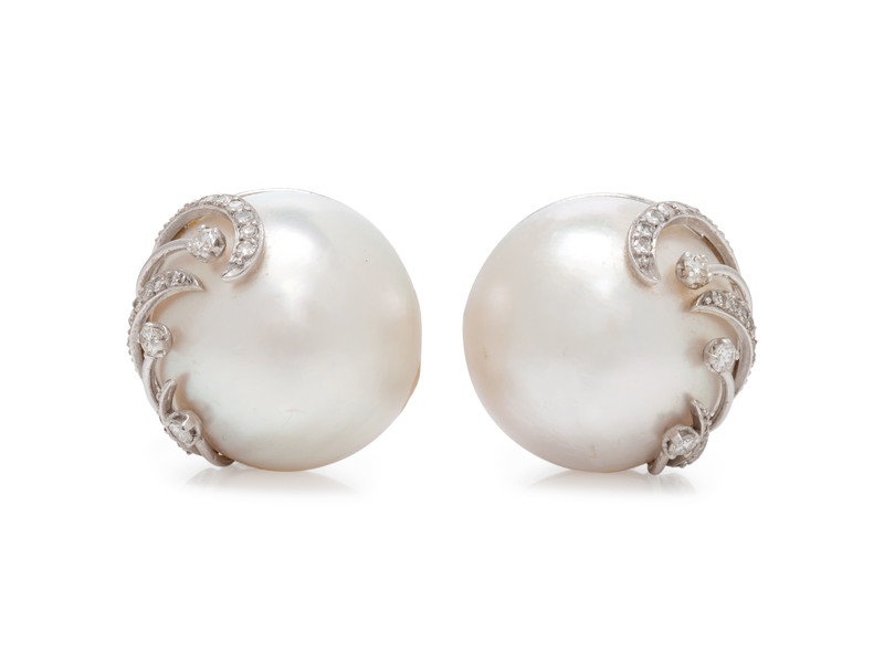 Containing two mabé pearls measuring approximately 20.00 mm in diameter, six round brilliant cut diamonds weighing approximately 0.22 carat total and 32 single cut diamonds, posts with clip backs.