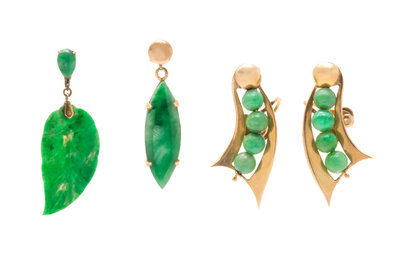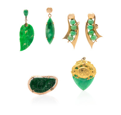 Consisting of a floral motif pendant containing one jade plaque, a pair of 14 karat gold screw back earrings containing eight round jadeite jade beads measuring approximately 5.60-5.75 mm in diameter, a single rose gold earring containing one navette shape jadeite jade measuring approximately 27.00 x 9.00 mm, a 14 karat rose gold pendant/brooch containing one carved and pierced green jadeite jade plaque measuring approximately 34.00 x 20.00 mm, together with a single yellow gold earring containing one leaf motif carved jadeite jade plaque measuring approximately 28.00 x 15.00 mm and one pear shape cabochon cut jade.