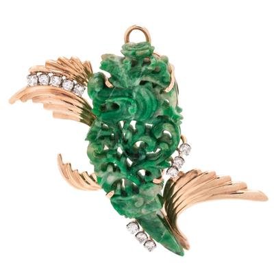Containing one carved and pierced jade measuring approximately 50.00 x 18.00 mm and 11 round brilliant cut diamonds weighing approximately 0.40 carat total. Mounted in yellow gold.