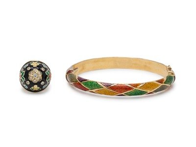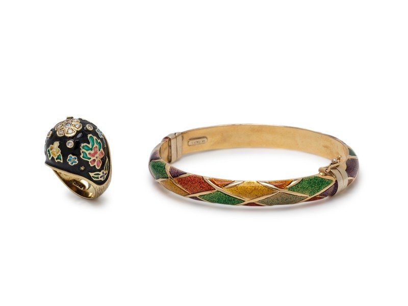 Consisting of a ring containing 11 single and round brilliant cut diamonds, black enamel background with polychrome enamel detail, and a bracelet with polychrome enamel detail.