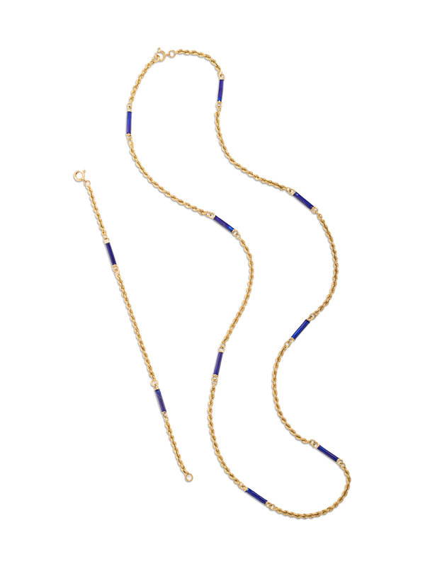 Consisting of a rope chain necklace interspersed with eight blue enamel tubular links, together with a matching bracelet.