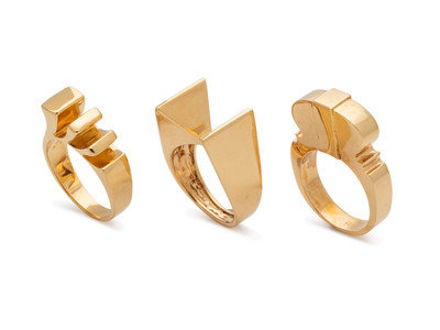 Consisting of a double pointed modernist ring, a stylized wave ring and a bombe ring.