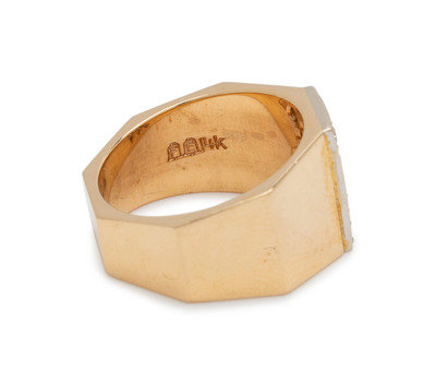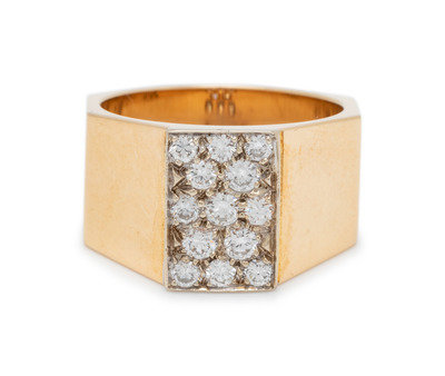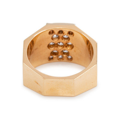 Consisting of a wide cigar band style with faceted sides containing 13 round brilliant cut diamonds weighing approximately 0.65 carat total.