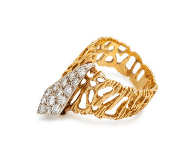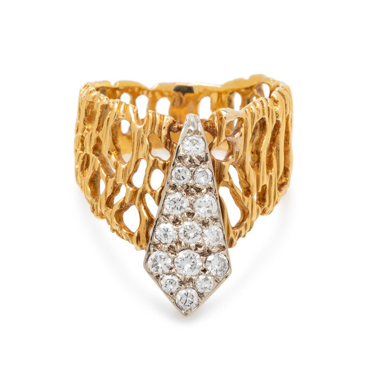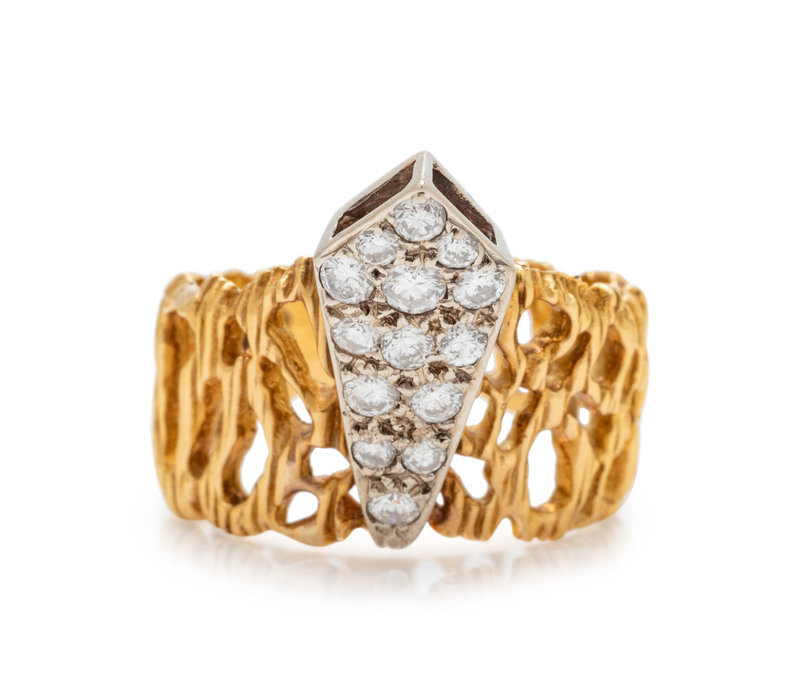 Consisting of a freeform yellow gold ring, with white gold section containing 14 round brilliant cut diamonds weighing approximately 0.50 carat total.