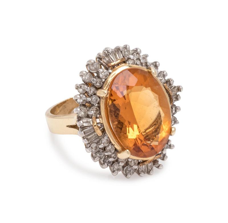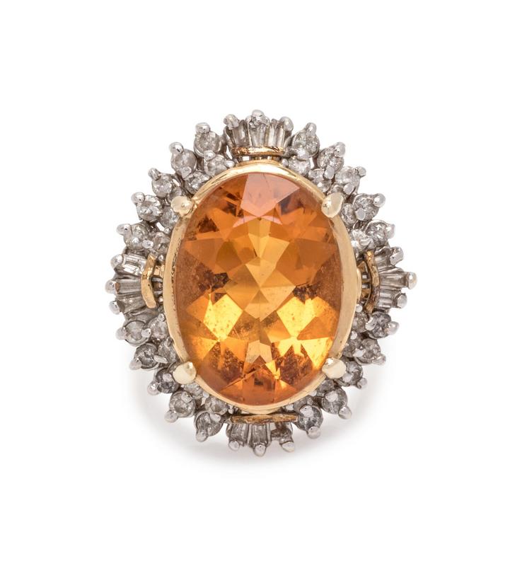 Containing one oval shape mixed cut citrine measuring approximately 18.10 x 13.00 x 7.90 mm, 11 tapered baguette cut diamonds weighing approximately 0.22 carat total and 40 round brilliant cut diamonds weighing approximately 0.80 carat total. Mounted in gold.