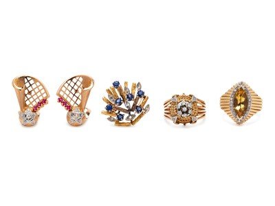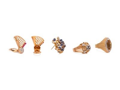 Consisting of a bicolor gold pendant/brooch containing seven round mixed cut sapphires and seven single cut diamonds, a bicolor gold ring containing 11 single cut diamonds, a yellow gold ring containing one marquise cut citrine measuring approximately 14.70 mm x 7.00 mm and 28 single cut diamonds, together with a pair of bicolor gold earclips containing 12 single and rose cut diamonds and six square step cut rubies.