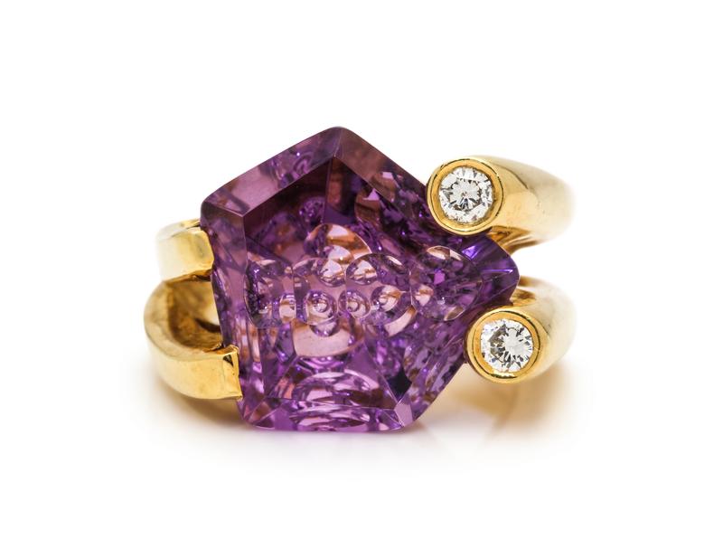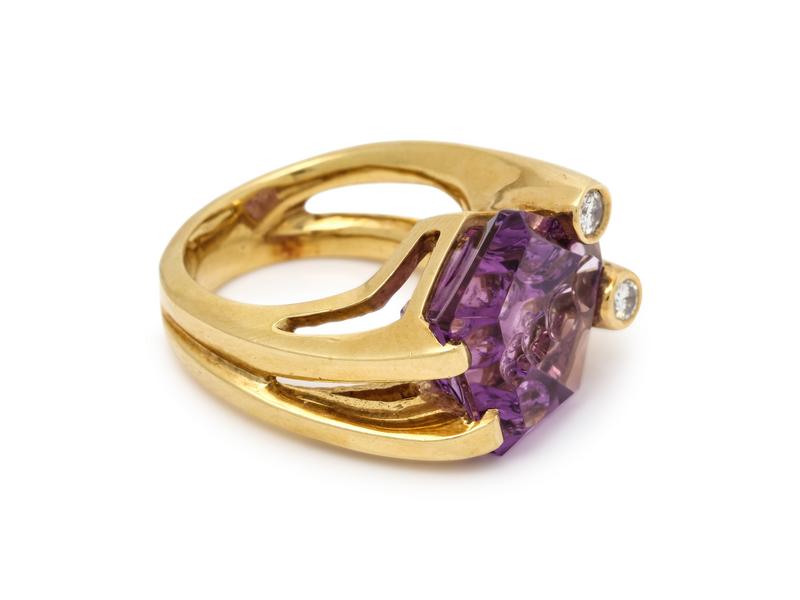 Containing one fantasy cut amethyst measuring approximately 16.30 x 16.30 x 9.30 mm and two round brilliant cut diamonds weighing approximately 0.25 carat total. Mounted in yellow gold.