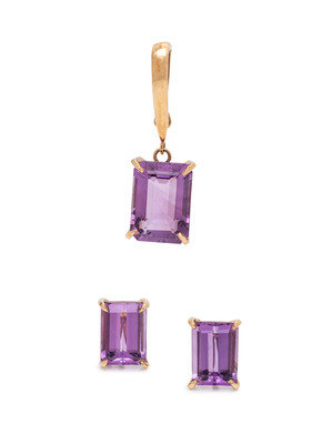 Consisting of a pendant containing one emerald cut amethyst measuring approximately 18.00 x 13.00 mm, together with a pair of earclips containing two emerald cut amethyst measuring approximately 14.00 x 10.00 mm.