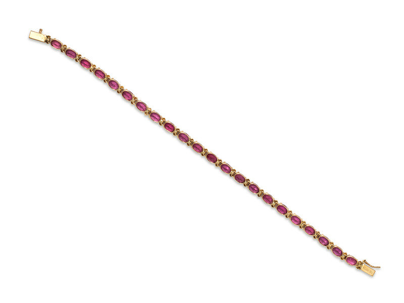 Containing 22 oval shape mixed cut reddish purple garnets measuring approximately 6.00 x 4.00 mm. Mounted in yellow gold.