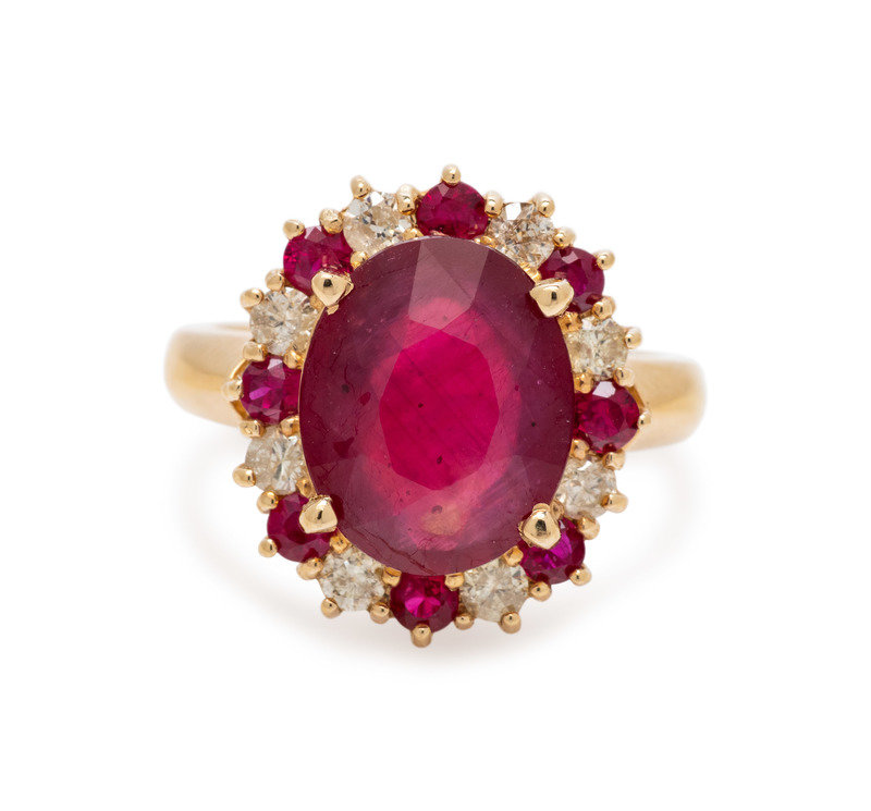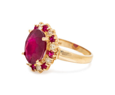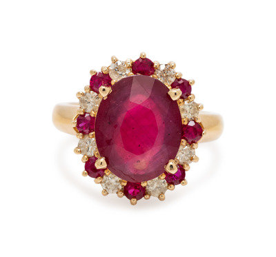 Containing one oval shape mixed cut ruby measuring approximately 12.15 x 9.75 x 5.40 mm, eight round brilliant cut diamonds weighing approximately 0.40 carat total and eight round mixed cut rubies measuring approximately 2.40 mm in diameter. Mounted in yellow gold.