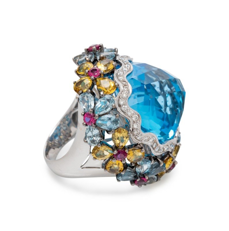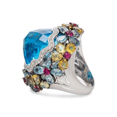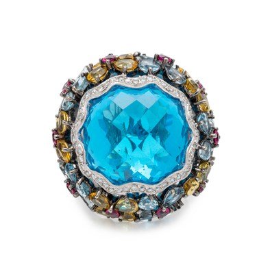Containing one round checkerboard cut blue topaz measuring approximately 22.00 x 22.00 x 15.00 mm, numerous round brilliant cut diamonds weighing approximately 0.62 carat total and sapphires, aquamarine, and citrine in various shapes. Mounted in white gold.