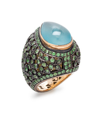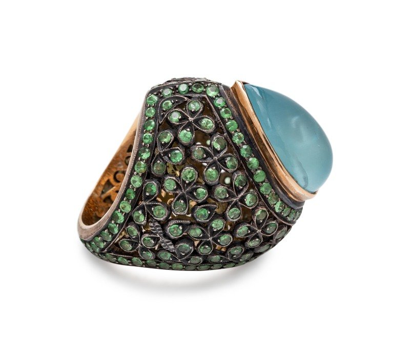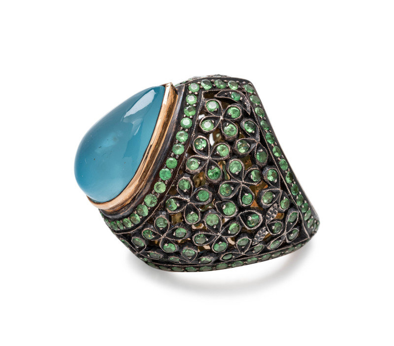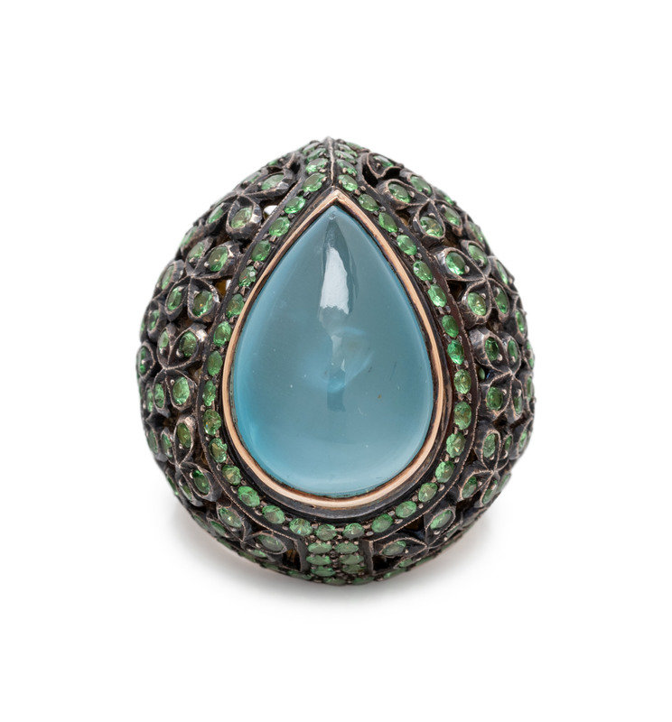 Containing one pear shape cabochon cut aquamarine measuring approximately 20.50 x 13.80 mm and numerous round mixed cut green gemstones measuring approximately 1.65-2.00 mm in diameter. Mounted in yellow gold and silver.