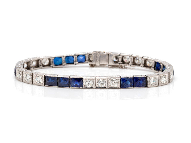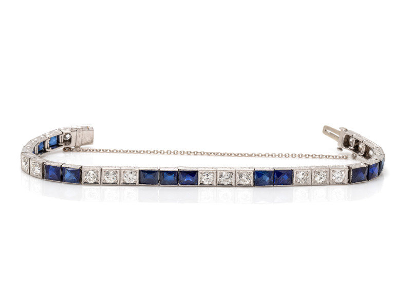 Containing 18 old European cut diamonds weighing approximately 2.70 carats total and 13 French cut synthetic sapphires. Mounted in platinum.