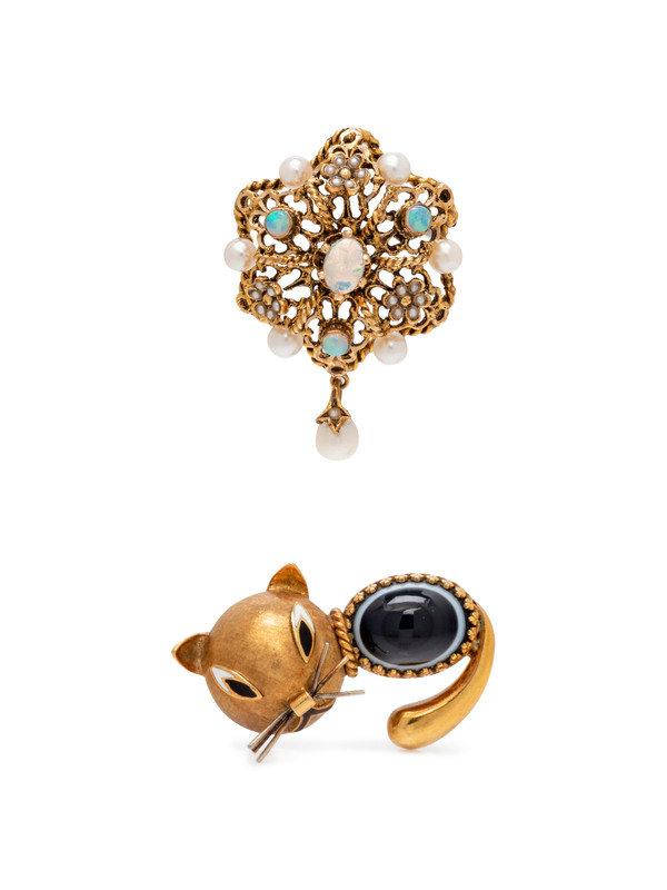 Consisting of a cat brooch containing one oval shape cabochon cut banded agate measuring approximately 14.00 x 11.00 mm, with white and black enamel detail, together with a pendant/brooch containing one oval shape cabochon cut opal, three round cabochon cut opals, one cultured pearl drop, six round cultured pearls and 19 seed pearls.