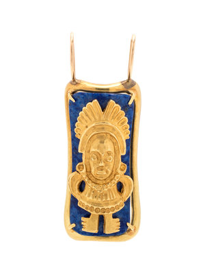 Consisting of a curved lapis lazuli plaque measuring approximately 39.00 x 19.00 mm, surmounted with a yellow gold Mesoamerican figure.