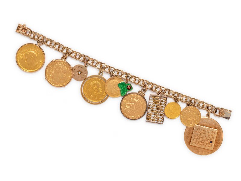 Consisting of a fancy link bracelet suspending a calendar charm with one sapphire, a Prussian 5 mark coin charm, dated 1877, a Republic of Singapore 5 Singold coin, dated 1986, an abacus charm, a Liberty coin charm, dated 1915, an enamel leaf and ladybug charm, a Prussian 5 mark coin charm, dated 1877, an Austrian 4 Ducat coin charm, dated 1915, a Herbert disc charm, a French 20 Franc coin charm, dated 1906, and an Iranian Pahlavi coin charm.