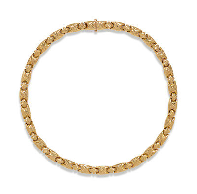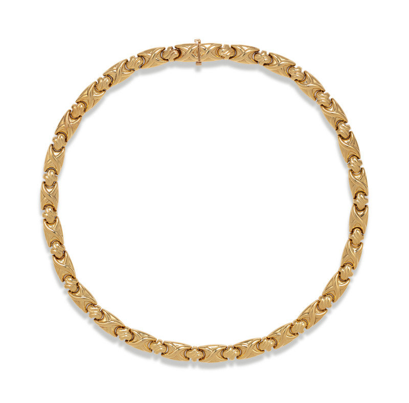 In a fancy 'x' link design measuring approximately 8.00 mm wide.