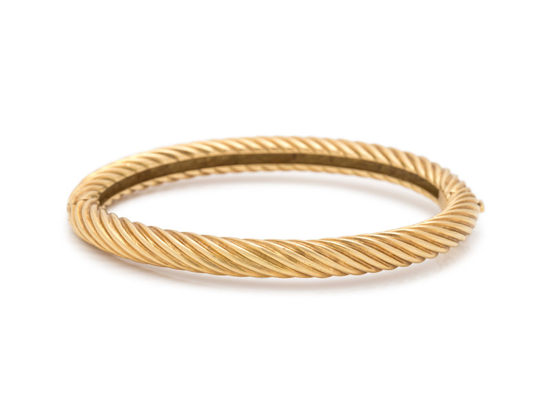 Consisting of a twisted bangle measuring approximately 6.00 mm wide, hinged with side clasp.