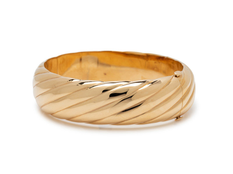 In a twist design, measuring approximately 18.20 mm wide, hinged with side clasp.