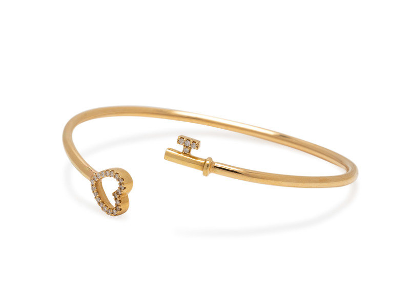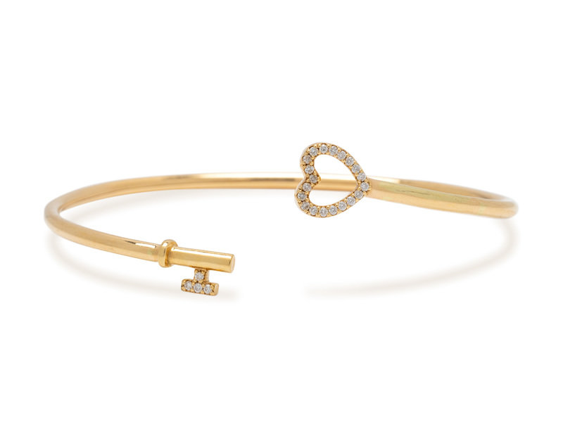 Consisting of a semi-flexible wire cuff with heart and key motif finials containing 24 round brilliant cut diamonds weighing approximately 0.10 carat total.