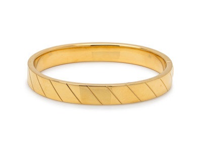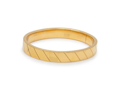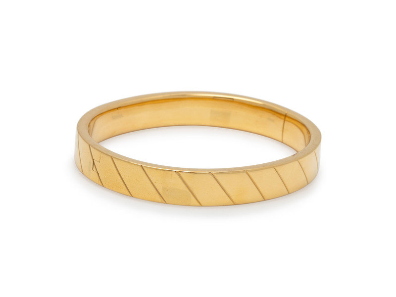 In a polished finish, measuring approximately 9.00 mm wide, hinged with side clasp.