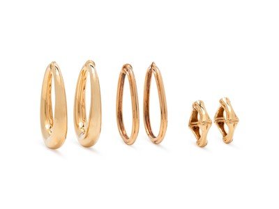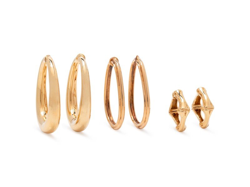 Consisting of a pair of oval ribbed hoops, a pair of oval polished hoops and a pair of bamboo style hoops.