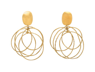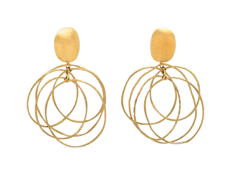 Consisting of concave oval shape earclips suspending interlocking textured gold wire circles.