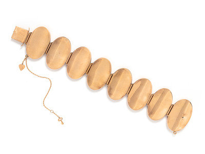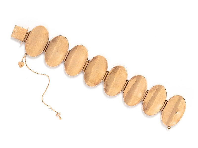 Consisting of eight rose gold oval shape links with yellow gold Asian motifs.