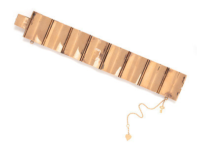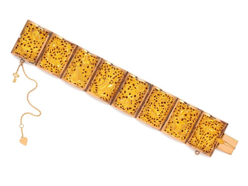Consisting of eight rose gold rectangular shape links with yellow gold Asian motifs.