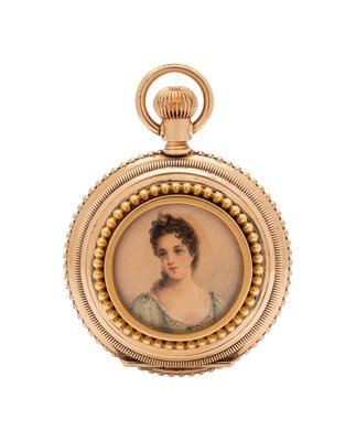 37.00 mm case diameter, white dial signed D.C. DUSENBERRY & SON, black Roman numerals, blued steel spade hands, subdial for seconds at 6 o'clock, painted enamel portrait case, stem wound and set manual wind nickel movement signed D.C. Dusenberry & Son.