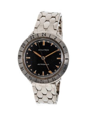 38.00 mm case diameter, black dial signed ACCUTRON ASTRONAUT, dot and triangular numerals, luminous pencil hands with center sweep seconds, rotating 24-hour GMT bezel, screw down case back, Cal. 214 electronic movement, hexagonal flexible link bracelet, deployant clasp.