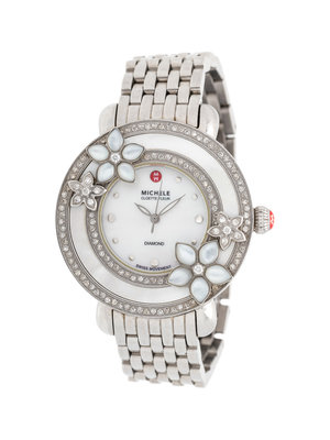 38.00 mm case diameter, mother-of-pearl dial signed MICHELE, applied steel dot numerals, luminous feuille hands with center sweep seconds, the bezel surmounted with mother-of-pearl and flower motifs containing 122 round brilliant cut diamonds weighing approximately 0.64 carat total, case back affixed by four screws, quartz movement, brick link bracelet, double deployant clasp.