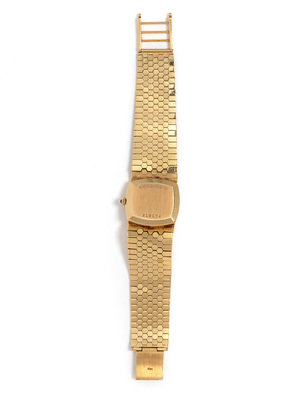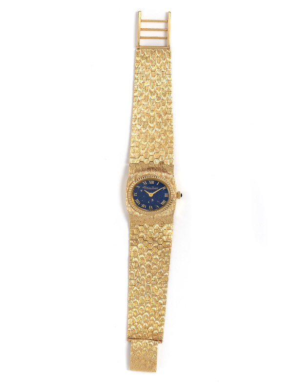 25.00 x 25.00 mm case dimensions, blue and gold flecked dial signed Lucien Piccard, gold Roman numerals, yellow gold tapered pencil hands, coin edge bezel, snap on case back, mechanical movement, integrated hexagonal textured link bracelet, fold over clasp.