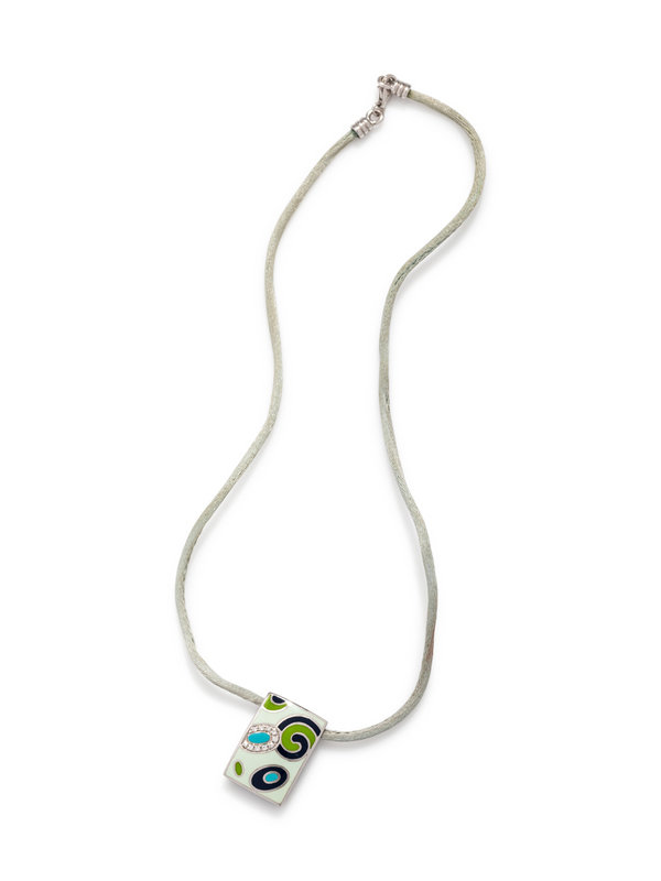 Consisting of a slide pendant with shades of blue and green enamel and 10 round brilliant cut diamonds weighing approximately 0.08 carat total, suspended from a cord necklace.